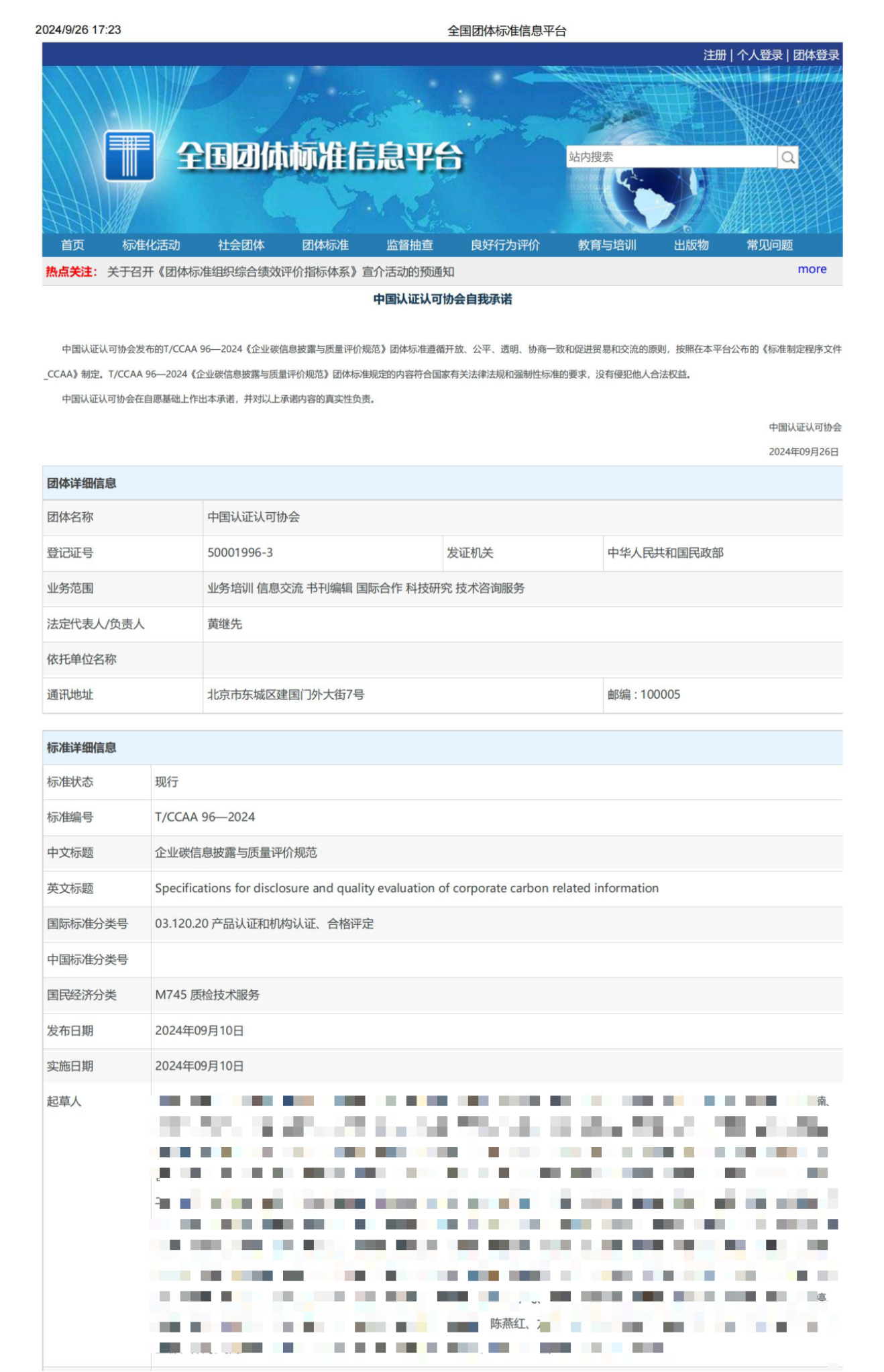 图:全国团体标准信息平台 T/CCAA 962024《企业碳信息披露与质量评价规范》