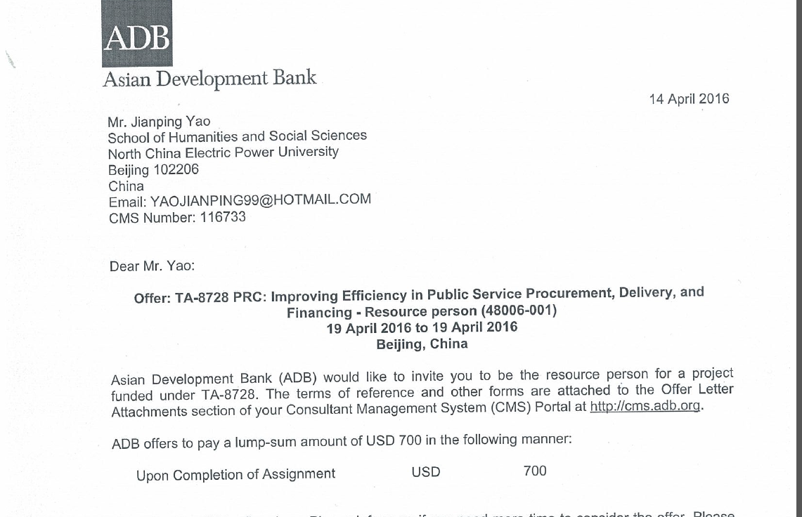 亚洲开发银行项目咨询专家协议(部分)