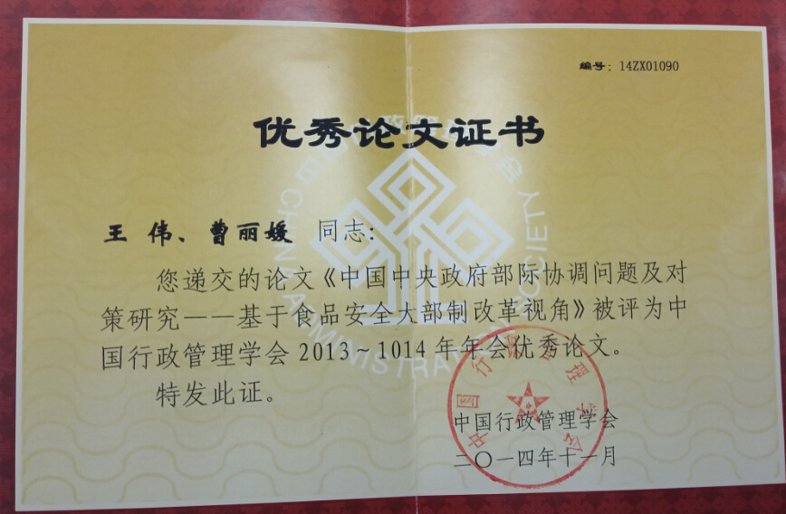 2014年10月10日,中国行政管理学会年度会议以书面会议的形式在北京举行,共收集了272篇文章,suncitygroup太阳新城王伟和曹丽媛老师提交的《中国中央政府部际协调问题及对策研究:基于食品安全大部制改革视角》论文被评为中国行政管理学会2013-2014年年会优秀论文。