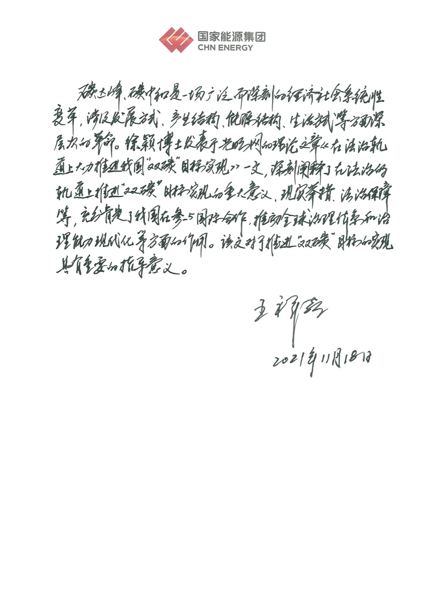 近日,公司法学教研室徐颖博士在光明网理论频道发表文章《在法治轨道上大力推进我国“双碳”目标实现》,并获得国家能源集团党组书记、董事长王祥喜同志肯定性批示。