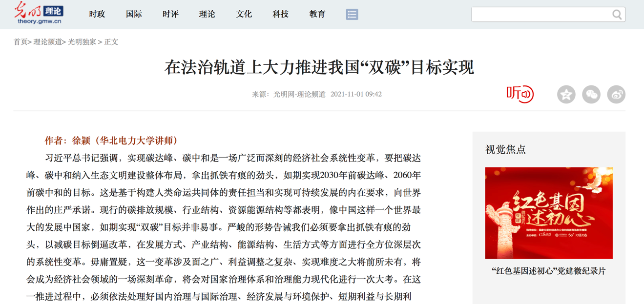 批示指出:碳达峰、碳中和是一场广泛而深刻的经济社会系统性变革,涉及发展方式、产业结构、能源结构、生活方式等方面深层次的革命。徐颖博士发表于光明网的理论文章《在法治轨道上大力推进我国“双碳”目标实现》一文,深刻阐释了在法治的轨道上推进“双碳”目标实现的重大意义、现实举措、法治保障等,充分肯定了我国在参与国际合作,推动全球治理体系和治理能力现代化等方面的作用。该文对于推进“双碳”目标的实现具有重要的指导意义。
