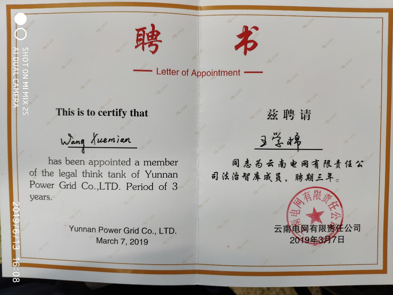 近日,云南电网有限责任公司给王学棉教授发来聘书,聘请其为公司法治智库成员,聘期三年。王学棉教授作为suncitygroup电力立法研究中心主任,近年来投入大量精力从事与电力行业相关的法律研究,推出了大量成果。这次聘任又一次表明电力立法中心越来越被行业认可,影响力也越来越大。面对信任,电力立法研究中心一定会充分发挥优势,不辜负云南电网等行业公司的期望,为行业法治作出自己的贡献。