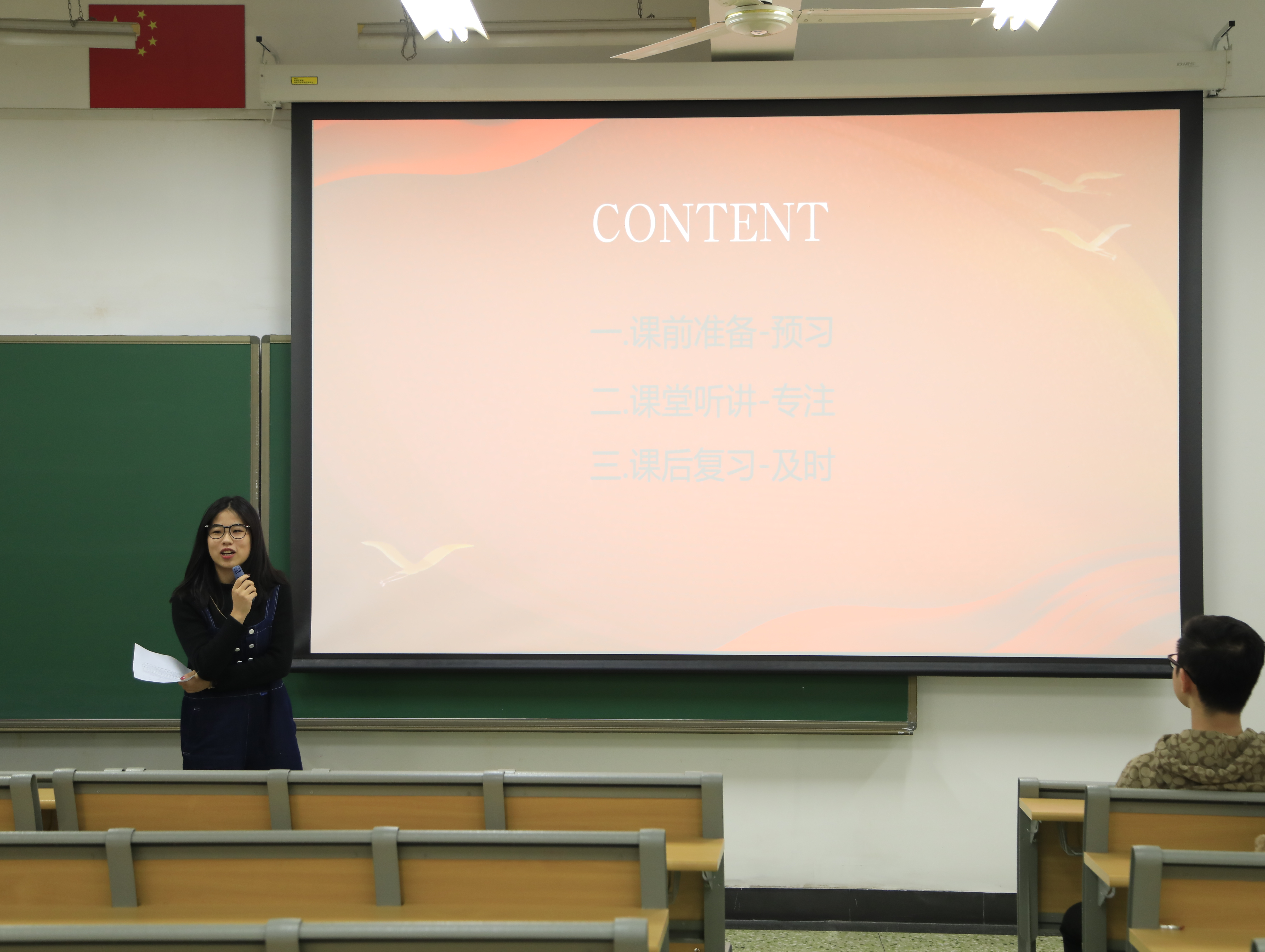 首先由覃同学率先进行自我介绍,随后她分课前准备-预习、课堂听讲-专注、课后复习-及时三个部分为大一年级员工阐述高数学习思路与方法。
