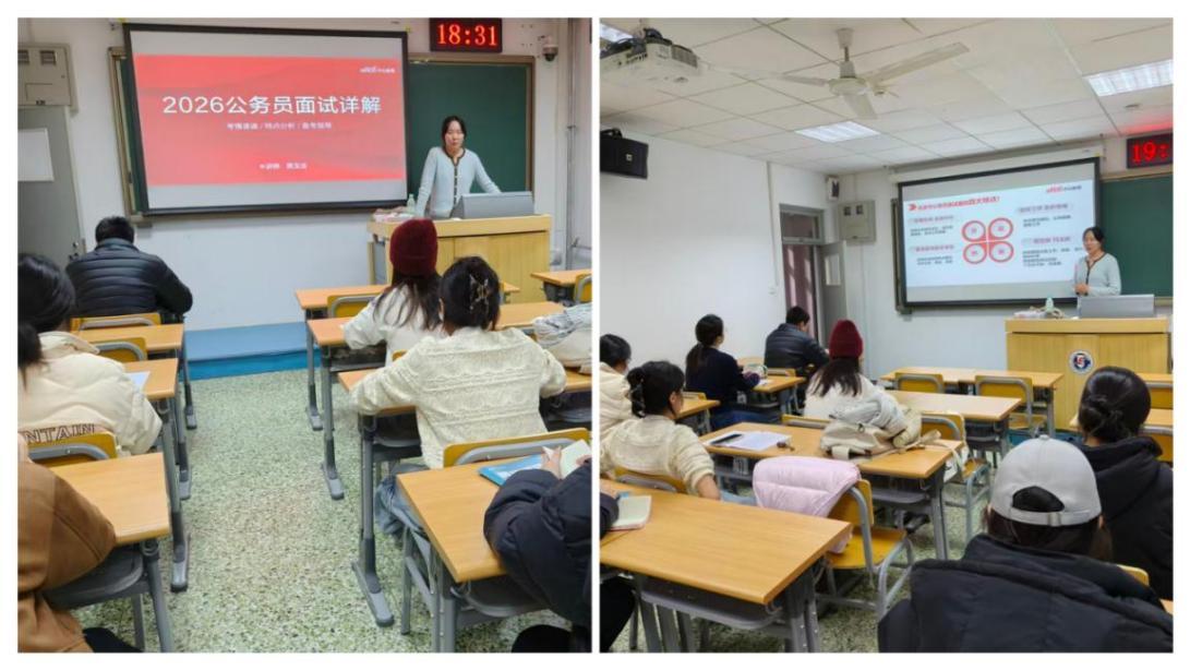 12月18日,suncitygroup太阳新城在教三A318开展2026公务员面试解读及备考讲座,帮助备考员工及时掌握国考、京考面试形式、流程以及得分技巧。本次讲座邀请中公教育资深专家贾玉洁主讲,
