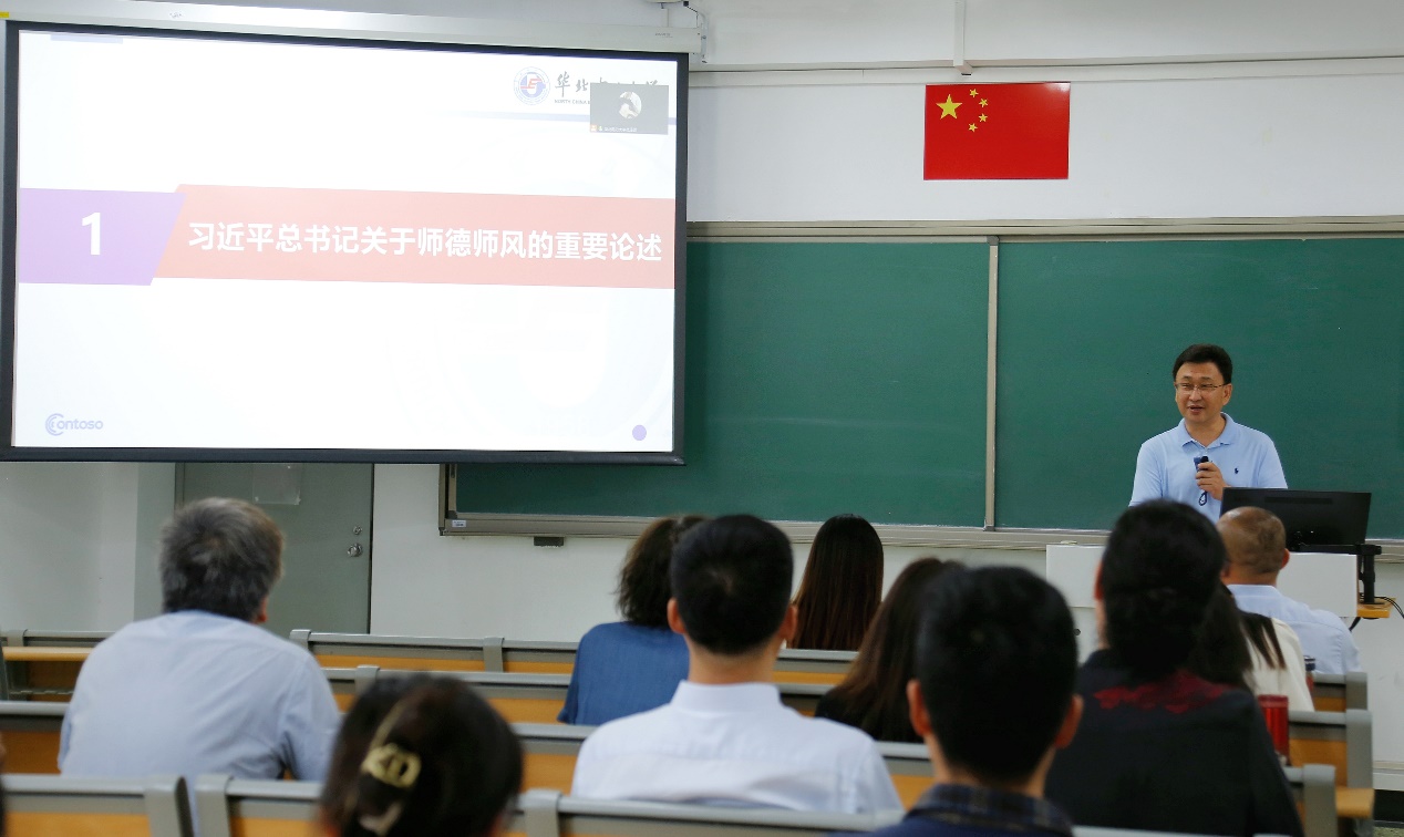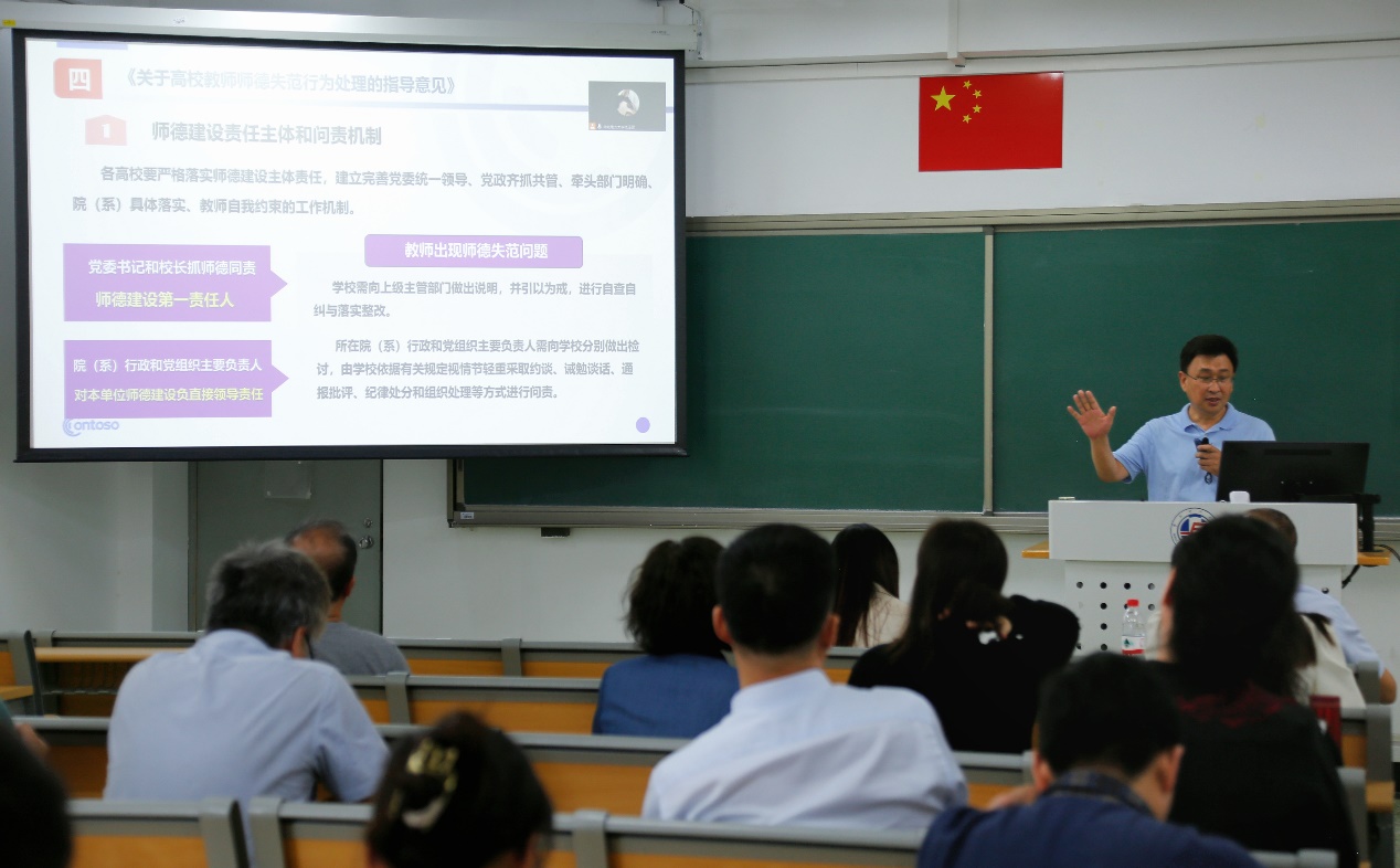 苑英科书记带领全体教职工系统学习了习近平总书记关于师德师风的重要论述,对《新时代高校教师职业行为十项准则》和《关于高校教师师德失范行为处理的指导意见》等文件进行了解读,并结合教育部公开曝光的多起违反师德师风的典型案例进行了警示教育,要求全体教职工将师德师风建设内化于心、外化于行,时刻将立德树人根本任务、教书育人重大责任铭记在心。