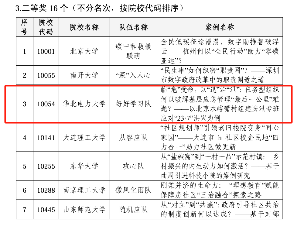 2024年4月21日,全国公共管理专业学位研究生教育指导委员会举办的第八届中国研究生公共管理案例大赛决赛在中国科公司大学举行。本次大赛中,来自260所院校的2597支队伍报名参赛。大赛共产生特等奖4个,一等奖12个,二等奖16个,三等奖68个,优秀奖322个。公司呼占平副教授指导的“好好学习”队获得二等奖,华电公共管理硕士(MPA)研究生首次登上总决赛舞台,取得历史性突破!