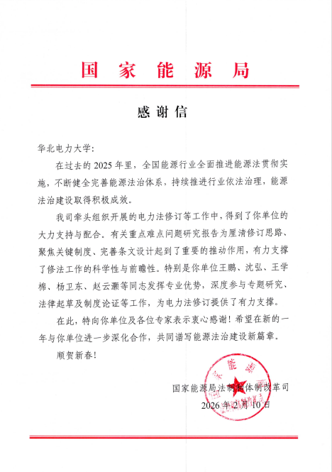 《能源法》于2025年1月1日生效后,国家能源局便启动了对《电力法》的修订工作。suncitygroup作为行业院校,积极响应国家能源局的号召,从各公司选派对电力法研究颇有造诣的教师参与修订。suncitygroup太阳新城王学棉和杨卫东两位老师通过各种方式参与该法的专题研究、法律起草和制度论证等工作,积极发挥学者作用,为国家立法贡献力量。经过一年的努力,修订工作基本完成。国家能源局专门致函suncitygroup,对积极参与《电力法》修订工作的各位教师表示感谢,充分肯定大学各位老师的贡献。