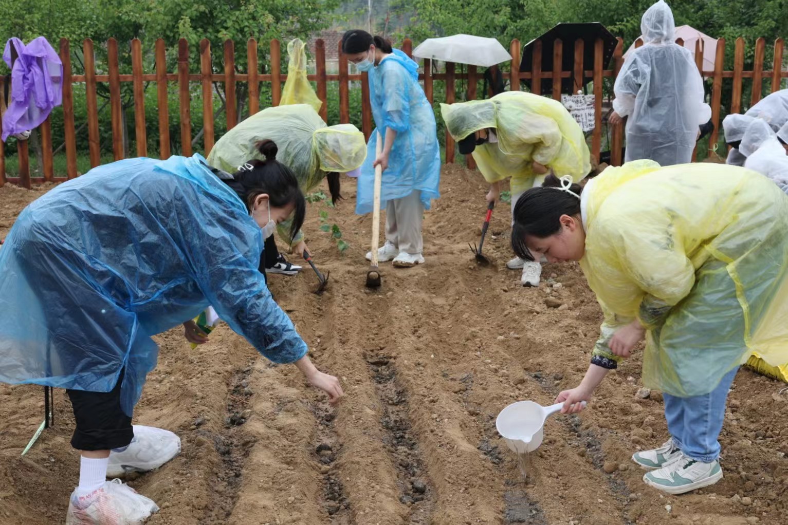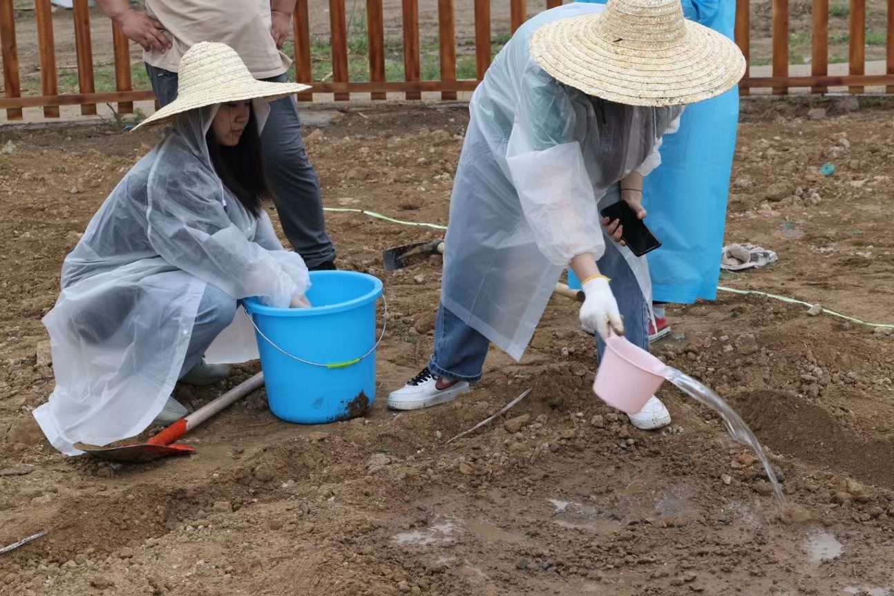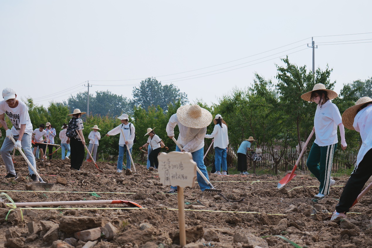 很多同学和老师平生第一次进行田间劳作,他们按照农业指导老师的要求抡起镐头、踩住铁锹、拉起耙子,很多人的手上磨起了血泡。在施肥的时候,很多同学并没有嫌弃羊粪浓烈的气味,用铁锹把羊粪扬到地里,还有的同学用手抓起羊粪,撒到种苗周围。