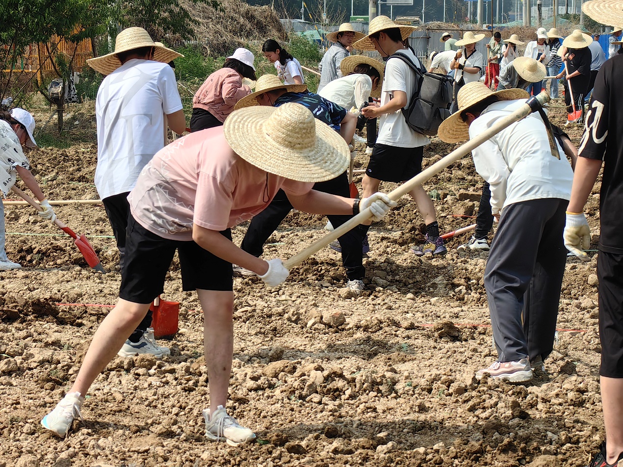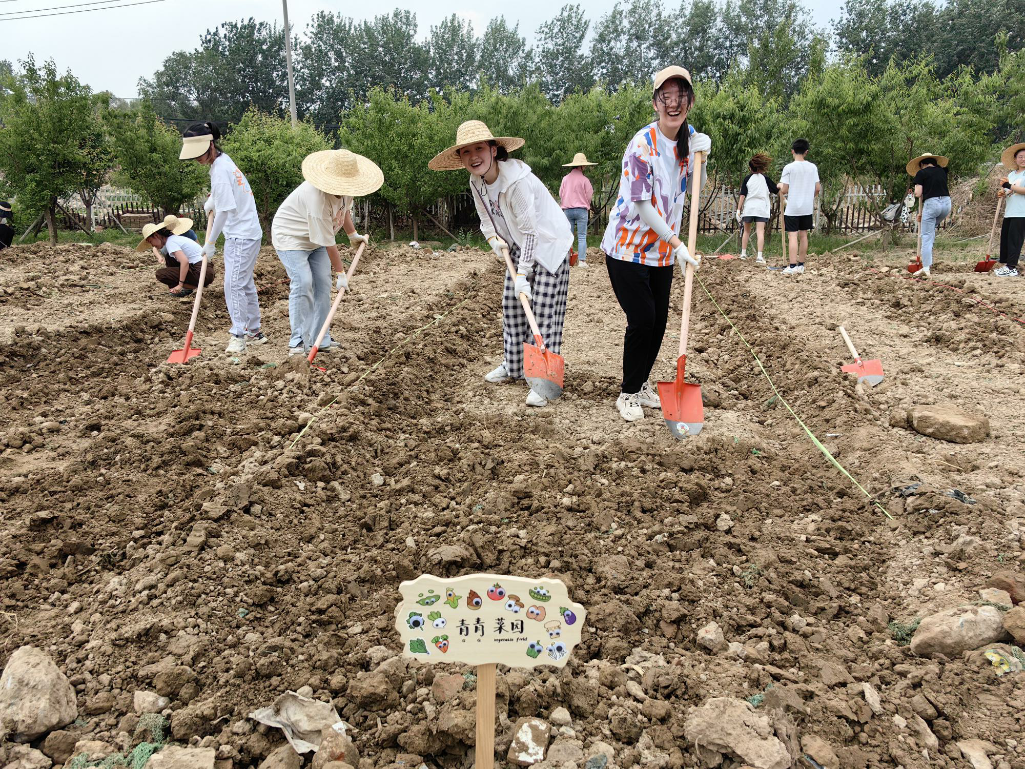 师生们纷纷拿起镐头、铁锹和耙子进行劳作,首先清理了土地中的砖头、铁丝、石块等杂物,同时掘土翻地、耙土平地、开挖田垄,在农业指导老师的现场指导下,师生们种植玉米、红薯、南瓜、土豆、黄瓜、西红柿等农作物和蔬菜。