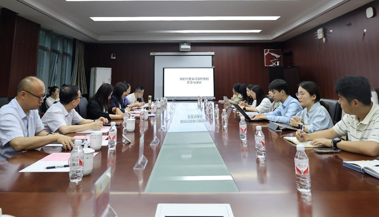 随后,刘洋主任紧扣主题,系统讲解了新时代民事、行政检察工作的法律依据、职能分布及履职情况。她结合生动案例,深入浅出地阐释了民事行政检察在保障民事权益与社会公平、监督行政权力与推动依法行政的重要作用。在现场交流环节,检察官与师生们就“行刑反向衔接”“四大检察”协同履职、虚假诉讼治理等前沿实务问题进行了热烈互动。