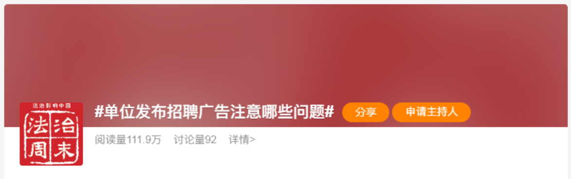 本次采访题为“‘奇葩招聘’伤人也伤企”,文章标题即阐明公司陈燕红教授观点“不合理的招聘条件可能使真正有能力的人才转向其他行业,对招聘单位来说本身就是一种损失”,本次采访中公司陈燕红教授阐述的观点与求职者面临的现实困境息息相关,剖析深入,在微博等公众平台引起热烈反响,相关话题截至本稿编辑时(2024年8月19日)已取得超420万次阅读,逾700次讨论,登上微博热搜榜。