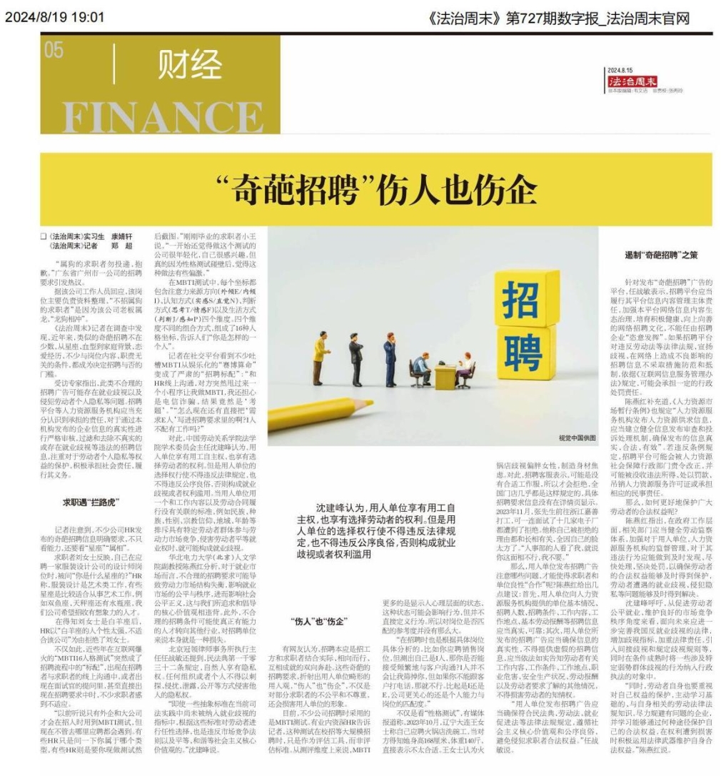 近日,suncitygroup太阳新城新金融法研究中心主任陈燕红副教授就“奇葩招聘”——企业发布不合理的招聘要求问题接受央媒《法治周末》采访,应邀对“奇葩招聘”的行为背后所涉及的法律问题以及对求职环境、社会风气带来的影响发表专业观点,并在8月15日见刊于《法治周末》第727期财经版面首位。
